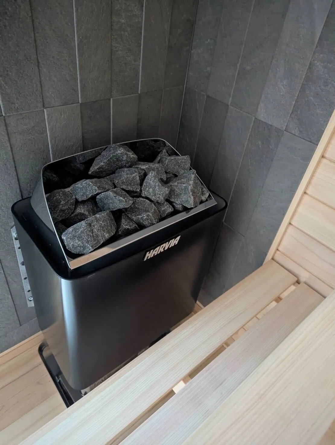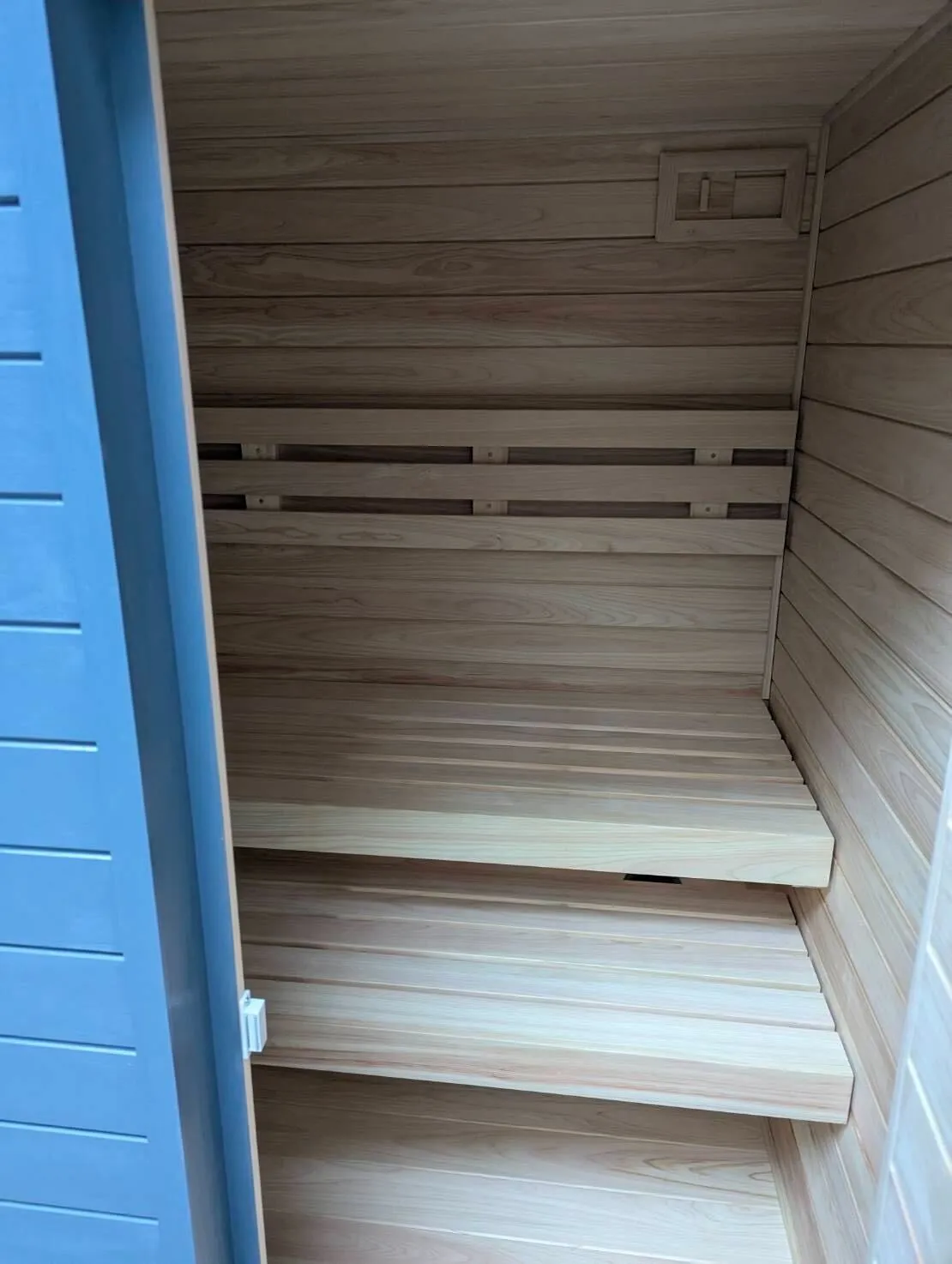 HOME 導入事例 ブルーグレイ塗装。3〜4人用屋外ボックスサウナ