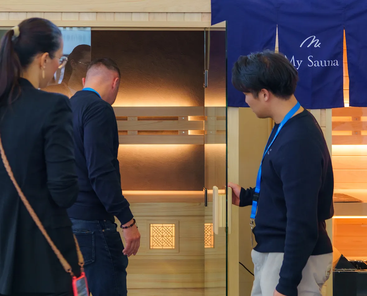 2025年10月に開催されたドイツの国際展示会「Aquanale 2025」にて、左官オプションを施したボックスサウナを出展いたしました。世界各国の方々から、その高いデザイン性と左官技術に対し、非常に多くの関心と高い評価をいただくことができました。(実際にドイツの現地住宅にも導入いただいております。)